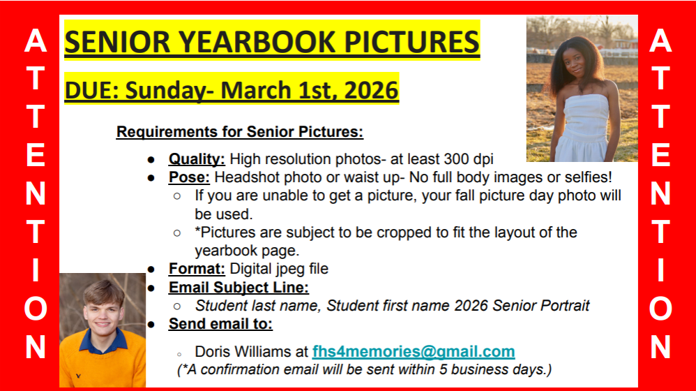 - Pose: Headshot photo or waist up. No full-body images or selfies! If you are unable to get a photo, your fall picture day photo will be used. Pictures are subject to being cropped to fit the layout of the yearbook page.